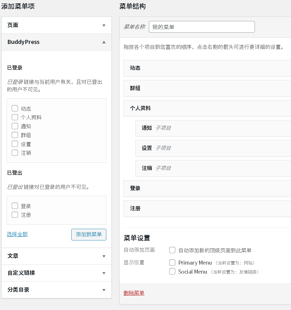 创建好菜单后,让我们来看看 BuddyPress 提供了哪些组件,及其功能: